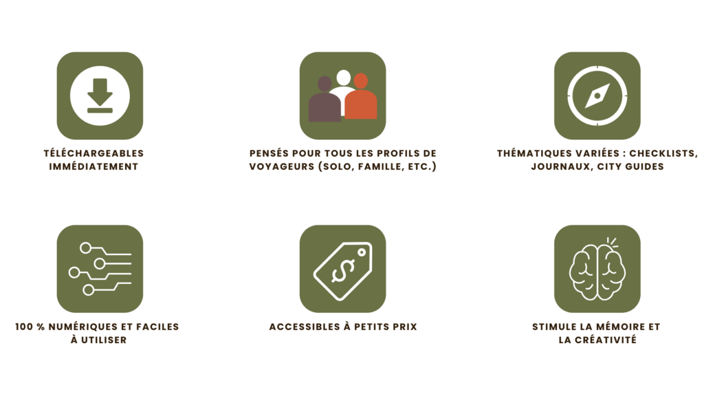 Chaque carnet vous offre un mini-guide pratique, une checklist locale et un espace pour noter vos plus beaux souvenirs.